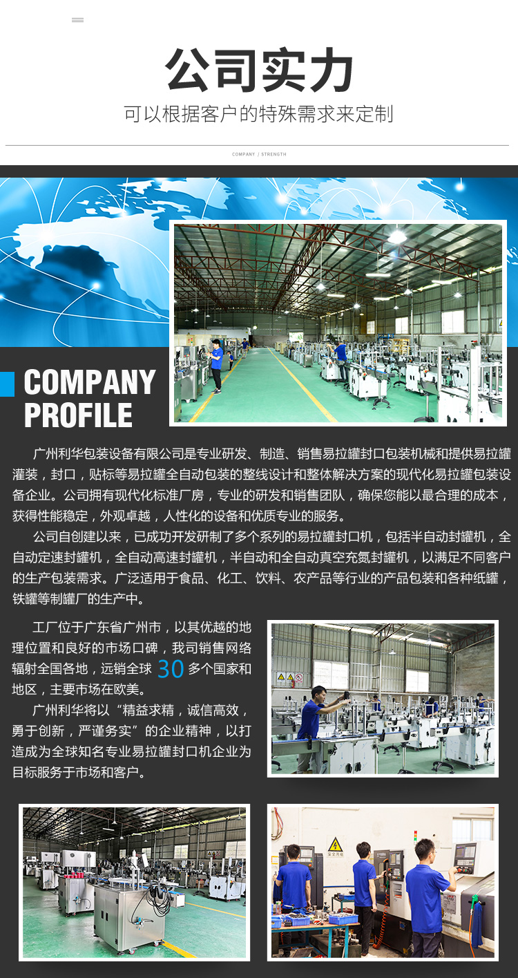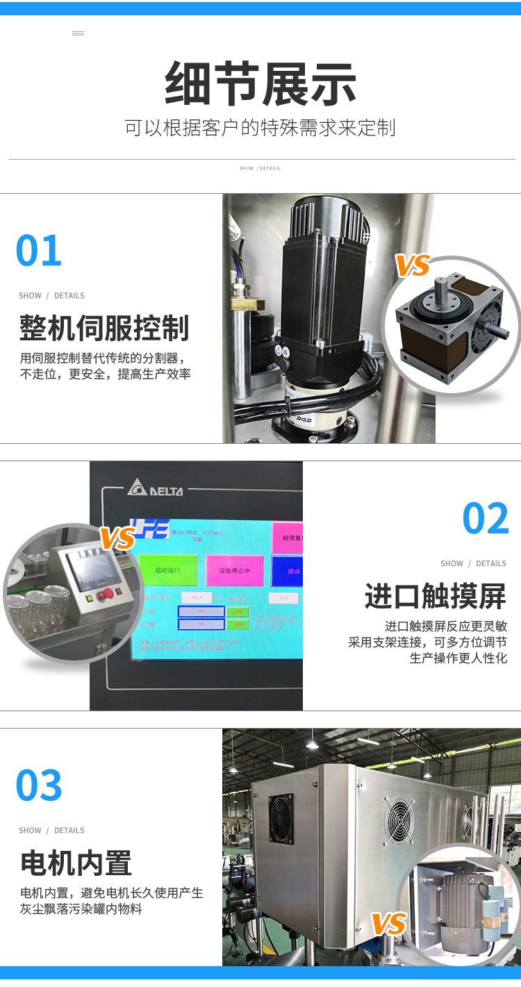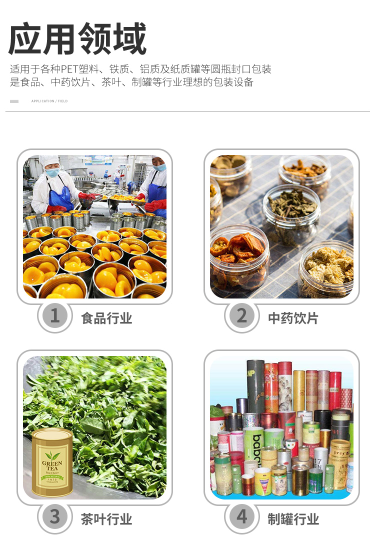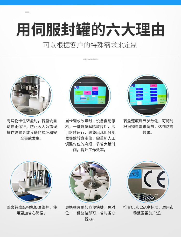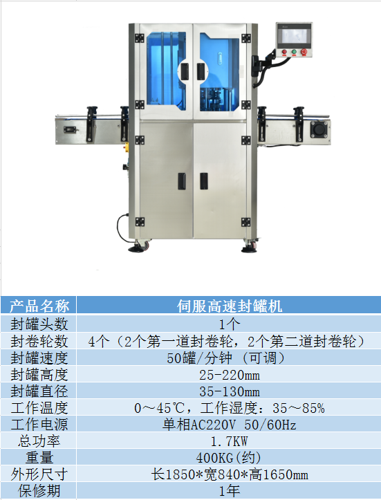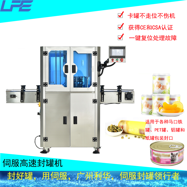 整機伺服控製,讓設(shè)備運行(háng)更加安全,穩定(dìng)和智能。有罐才啟動轉盤;轉盤速度可單獨(dú)調節;當出現卡罐時,轉盤會自動(dòng)停機,一鍵複位後即可解除故障再次運行;有異物卡住轉盤時,轉盤會自(zì)動停止運行,防止因人為錯(cuò)誤操(cāo)作設備而造成設備的損壞和安全事故的發生。適用於馬口鐵罐,鋁罐,塑料罐和鐵罐包裝的產品封(fēng)罐,是食品,飲(yǐn)料,中藥飲品(pǐn),化工等行業的理想包裝設備。